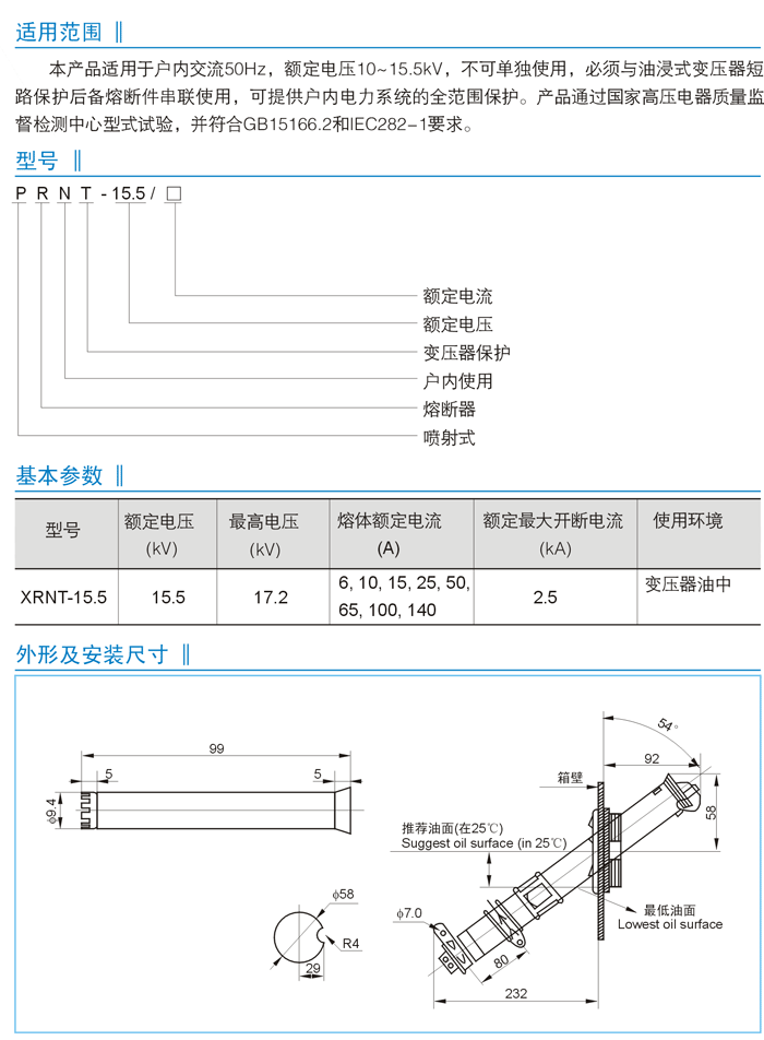 油浸式變壓器過(guò)載保護(hù)用高壓限流熔斷器